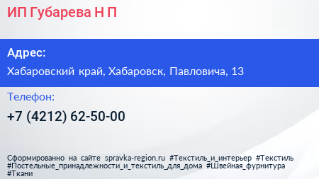 ИП Губарева Н.П. по адресу Хабаровский край, Хабаровск, Павловича, 13 в дальнейшем Организация, размещена в следующих категориях:
