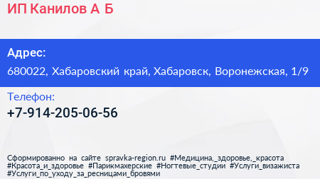 ИП Канилов А.Б. по адресу 680022, Хабаровский край, Хабаровск, Воронежская, 1/9 в дальнейшем Организация, размещена в следующих категориях: