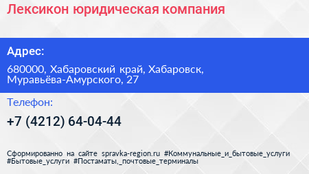 Лексикон, юридическая компания по адресу 680000, Хабаровский край, Хабаровск, Муравьёва-Амурского, 27 в дальнейшем Организация, размещена в следующих категориях: