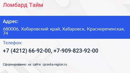 Ломбард Тайм по адресу 680006, Хабаровский край, Хабаровск, Краснореченская, 74 в дальнейшем Организация, размещена в следующих категориях: