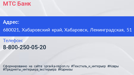 МТС-Банк по адресу 680021, Хабаровский край, Хабаровск, Ленинградская, 51 в дальнейшем Организация, размещена в следующих категориях: