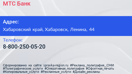 МТС-Банк по адресу Хабаровский край, Хабаровск, Ленина, 44 в дальнейшем Организация, размещена в следующих категориях: