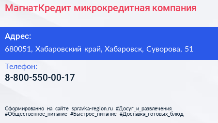МагнатКредит, микрокредитная компания по адресу 680051, Хабаровский край, Хабаровск, Суворова, 51 в дальнейшем Организация, размещена в следующих категориях: