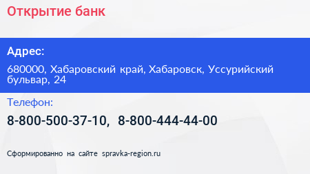 Открытие, банк по адресу 680000, Хабаровский край, Хабаровск, Уссурийский бульвар, 24 в дальнейшем Организация, размещена в следующих категориях: