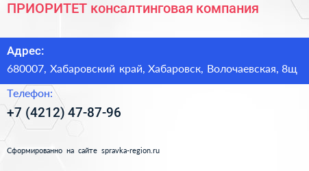 ПРИОРИТЕТ, консалтинговая компания по адресу 680007, Хабаровский край, Хабаровск, Волочаевская, 8щ в дальнейшем Организация, размещена в следующих категориях: