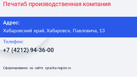 Печати5, производственная компания по адресу Хабаровский край, Хабаровск, Павловича, 13 в дальнейшем Организация, размещена в следующих категориях: