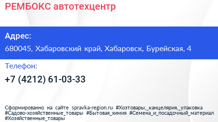 РЕМБОКС, автотехцентр по адресу 680045, Хабаровский край, Хабаровск, Бурейская, 4 в дальнейшем Организация, размещена в следующих категориях: