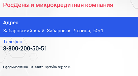 РосДеньги, микрокредитная компания по адресу Хабаровский край, Хабаровск, Ленина, 50/1 в дальнейшем Организация, размещена в следующих категориях: