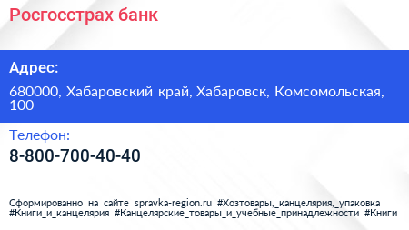 Росгосстрах банк по адресу 680000, Хабаровский край, Хабаровск, Комсомольская, 100 в дальнейшем Организация, размещена в следующих категориях: