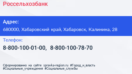 Россельхозбанк по адресу 680000, Хабаровский край, Хабаровск, Калинина, 28 в дальнейшем Организация, размещена в следующих категориях:
