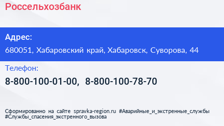 Россельхозбанк по адресу 680051, Хабаровский край, Хабаровск, Суворова, 44 в дальнейшем Организация, размещена в следующих категориях: