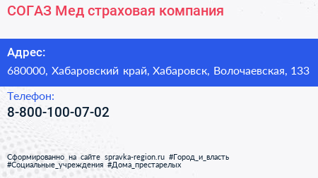 СОГАЗ-Мед, страховая компания по адресу 680000, Хабаровский край, Хабаровск, Волочаевская, 133 в дальнейшем Организация, размещена в следующих категориях: