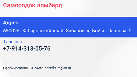 Самородок, ломбард по адресу 680026, Хабаровский край, Хабаровск, Бойко-Павлова, 2 в дальнейшем Организация, размещена в следующих категориях: