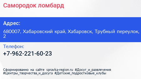 Самородок, ломбард по адресу 680007, Хабаровский край, Хабаровск, Трубный переулок, 2 в дальнейшем Организация, размещена в следующих категориях: