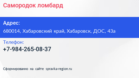 Самородок, ломбард по адресу 680014, Хабаровский край, Хабаровск, ДОС, 43а в дальнейшем Организация, размещена в следующих категориях:
