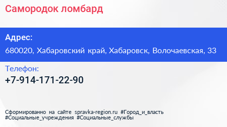 Самородок, ломбард по адресу 680020, Хабаровский край, Хабаровск, Волочаевская, 33 в дальнейшем Организация, размещена в следующих категориях: