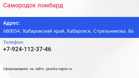 Самородок, ломбард по адресу 680054, Хабаровский край, Хабаровск, Стрельникова, 8а в дальнейшем Организация, размещена в следующих категориях: