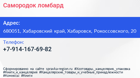Самородок, ломбард по адресу 680051, Хабаровский край, Хабаровск, Рокоссовского, 20 в дальнейшем Организация, размещена в следующих категориях:
