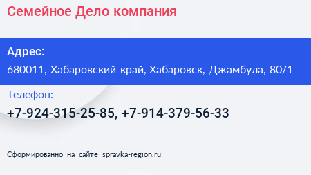 Семейное Дело, компания по адресу 680011, Хабаровский край, Хабаровск, Джамбула, 80/1 в дальнейшем Организация, размещена в следующих категориях: