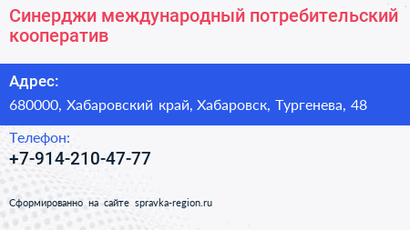 Синерджи, международный потребительский кооператив по адресу 680000, Хабаровский край, Хабаровск, Тургенева, 48 в дальнейшем Организация, размещена в следующих категориях: