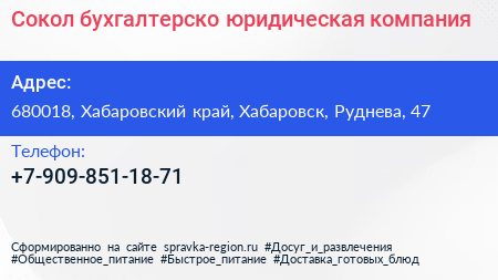 Сокол, бухгалтерско-юридическая компания по адресу 680018, Хабаровский край, Хабаровск, Руднева, 47 в дальнейшем Организация, размещена в следующих категориях: