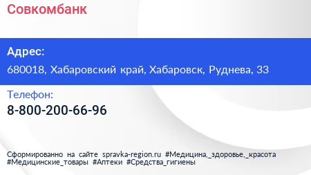 Совкомбанк по адресу 680018, Хабаровский край, Хабаровск, Руднева, 33 в дальнейшем Организация, размещена в следующих категориях: