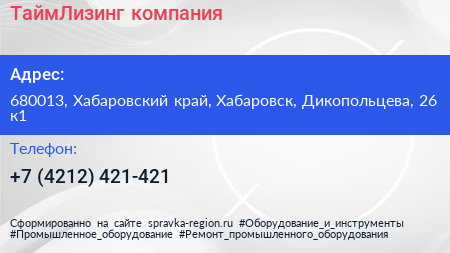 ТаймЛизинг, компания по адресу 680013, Хабаровский край, Хабаровск, Дикопольцева, 26 к1 в дальнейшем Организация, размещена в следующих категориях: