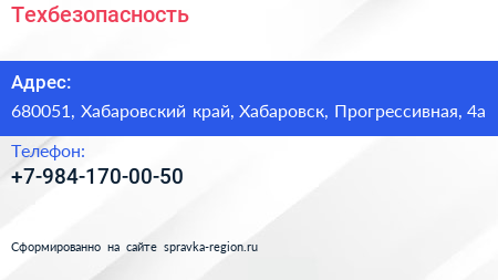 Техбезопасность по адресу 680051, Хабаровский край, Хабаровск, Прогрессивная, 4а в дальнейшем Организация, размещена в следующих категориях: