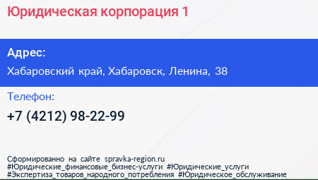 Юридическая корпорация №1 по адресу Хабаровский край, Хабаровск, Ленина, 38 в дальнейшем Организация, размещена в следующих категориях:
