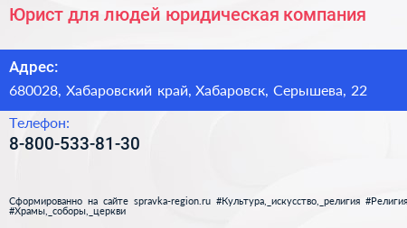Юрист для людей, юридическая компания по адресу 680028, Хабаровский край, Хабаровск, Серышева, 22 в дальнейшем Организация, размещена в следующих категориях: