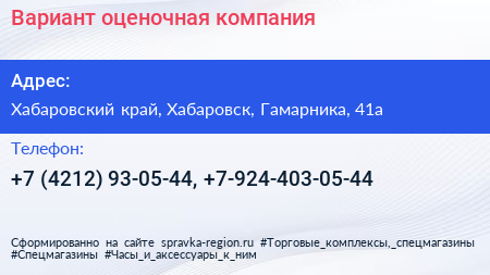 Вариант, оценочная компания по адресу Хабаровский край, Хабаровск, Гамарника, 41а в дальнейшем Организация, размещена в следующих категориях: