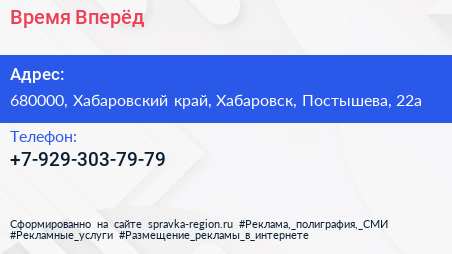 Время Вперёд по адресу 680000, Хабаровский край, Хабаровск, Постышева, 22а в дальнейшем Организация, размещена в следующих категориях:
