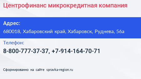 Центрофинанс, микрокредитная компания по адресу 680018, Хабаровский край, Хабаровск, Руднева, 56а в дальнейшем Организация, размещена в следующих категориях: