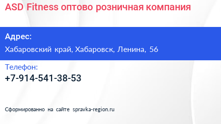 ASD-Fitness, оптово-розничная компания по адресу Хабаровский край, Хабаровск, Ленина, 56 в дальнейшем Организация, размещена в следующих категориях: