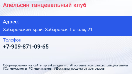 Апельсин, танцевальный клуб по адресу Хабаровский край, Хабаровск, Гоголя, 21 в дальнейшем Организация, размещена в следующих категориях: