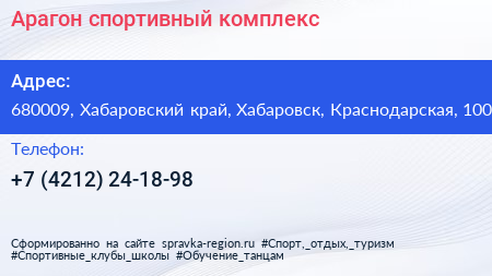 Арагон, спортивный комплекс по адресу 680009, Хабаровский край, Хабаровск, Краснодарская, 100 в дальнейшем Организация, размещена в следующих категориях: