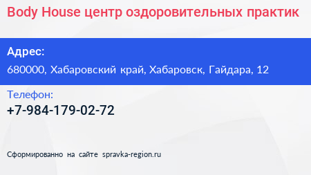 Body House, центр оздоровительных практик по адресу 680000, Хабаровский край, Хабаровск, Гайдара, 12 в дальнейшем Организация, размещена в следующих категориях: