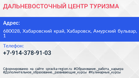 ДАЛЬНЕВОСТОЧНЫЙ ЦЕНТР ТУРИЗМА по адресу 680028, Хабаровский край, Хабаровск, Амурский бульвар, 1 в дальнейшем Организация, размещена в следующих категориях: