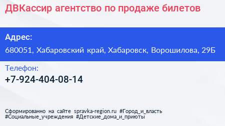 ДВКассир, агентство по продаже билетов по адресу 680051, Хабаровский край, Хабаровск, Ворошилова, 29Б в дальнейшем Организация, размещена в следующих категориях:
