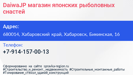 DaiwaJP, магазин японских рыболовных снастей по адресу 680014, Хабаровский край, Хабаровск, Бикинская, 16 в дальнейшем Организация, размещена в следующих категориях: