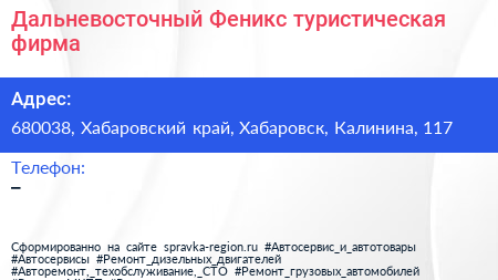 Дальневосточный Феникс, туристическая фирма по адресу 680038, Хабаровский край, Хабаровск, Калинина, 117 в дальнейшем Организация, размещена в следующих категориях: