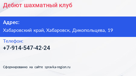 Дебют, шахматный клуб по адресу Хабаровский край, Хабаровск, Дикопольцева, 19 в дальнейшем Организация, размещена в следующих категориях: