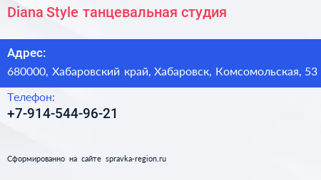 Diana Style, танцевальная студия по адресу 680000, Хабаровский край, Хабаровск, Комсомольская, 53 в дальнейшем Организация, размещена в следующих категориях:
