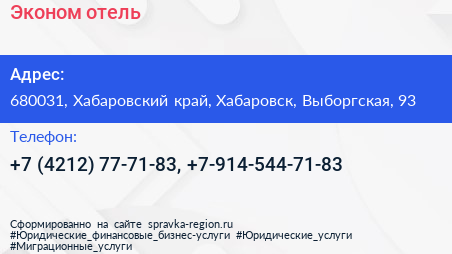 Эконом, отель по адресу 680031, Хабаровский край, Хабаровск, Выборгская, 93 в дальнейшем Организация, размещена в следующих категориях: