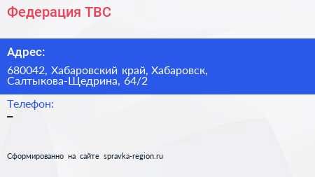 Федерация ТВС по адресу 680042, Хабаровский край, Хабаровск, Салтыкова-Щедрина, 64/2 в дальнейшем Организация, размещена в следующих категориях: