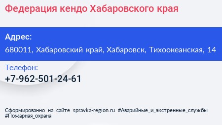 Федерация кендо Хабаровского края по адресу 680011, Хабаровский край, Хабаровск, Тихоокеанская, 14 в дальнейшем Организация, размещена в следующих категориях: