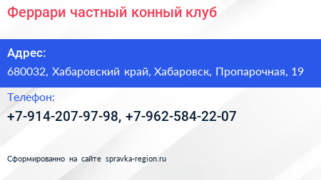Феррари, частный конный клуб по адресу 680032, Хабаровский край, Хабаровск, Пропарочная, 19 в дальнейшем Организация, размещена в следующих категориях: