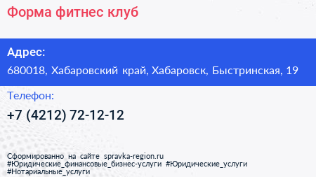Форма, фитнес-клуб по адресу 680018, Хабаровский край, Хабаровск, Быстринская, 19 в дальнейшем Организация, размещена в следующих категориях: