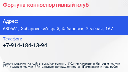 Фортуна, конноспортивный клуб по адресу 680561, Хабаровский край, Хабаровск, Зелёная, 167 в дальнейшем Организация, размещена в следующих категориях: