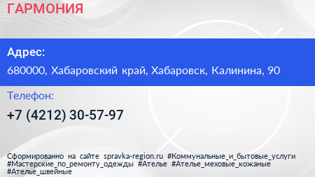 ГАРМОНИЯ по адресу 680000, Хабаровский край, Хабаровск, Калинина, 90 в дальнейшем Организация, размещена в следующих категориях: